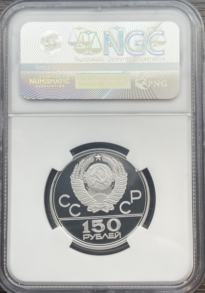 Сверху герб СССР с 15 витками ленты, слева от него буквы «СС», справа «СР», ниже двойная черта, под ней обозначение достоинства монеты цифра «150» и ниже слово «РУБЛЕЙ».