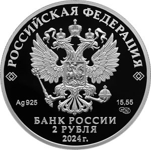 рельефное изображение Государственного герба Российской Федерации, над ним вдоль канта – надпись полукругом «РОССИЙСКАЯ ФЕДЕРАЦИЯ», обрамленная с обеих сторон сдвоенными ромбами, под гербом слева – обозначения драгоценного металла и пробы сплава, справа – содержание химически чистого металла и товарный знак монетного двора, внизу в центре в три строки – надпись «БАНК РОССИИ», номинал монеты «2 РУБЛЯ», год выпуска «2024 г.».
