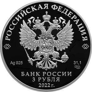 рельефное изображение Государственного герба Российской Федерации, над ним вдоль канта — надпись полукругом: «РОССИЙСКАЯ ФЕДЕРАЦИЯ», обрамленная с обеих сторон сдвоенными ромбами, внизу под гербом: слева — обозначения драгоценного металла и пробы сплава, справа — содержание химически чистого металла и товарный знак монетного двора, внизу в центре в три строки — надпись: «БАНК РОССИИ», номинал монеты: «3 РУБЛЯ», год выпуска: «2022 г.».