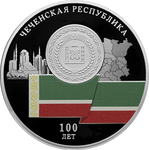 Серебряная монета 3 рубля "100-летие образования Чеченской Республики" 2022г., 31,1 г. 925 проба, ПРУФ