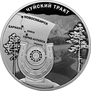 Серебряная монета 3 рубля "К 100-летию признания Чуйского тракта дорогой государственного значения" 2022г., 31,1 г. 925 проба, ПРУФ
