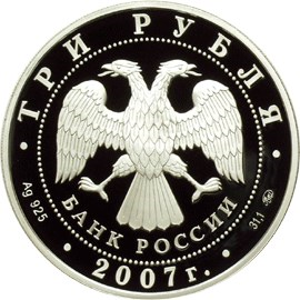 Аверс: вверху вдоль канта номинал «ТРИ РУБЛЯ», внизу слева химическое название «Ag» и проба «925» металла, внизу по центру год выпуска «2007 г.», внизу справа чистый вес находящегося в монете драгоценного металла «31,10» и монограмма монетного двора «ММД». В середине в ободке из точек двуглавый орел под ним с внутренней стороны точечного ободка слова «БАНК РОССИИ».