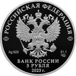 рельефное изображение Государственного герба Российской Федерации, над ним вдоль канта – надпись полукругом: «РОССИЙСКАЯ ФЕДЕРАЦИЯ», обрамленная с обеих сторон сдвоенными ромбами, под гербом: слева – обозначения драгоценного металла и пробы сплава, справа – содержание химически чистого металла и товарный знак монетного двора, внизу в центре в три строки – надпись: «БАНК РОССИИ», номинал монеты: «3 РУБЛЯ», год выпуска: «2023 г.».