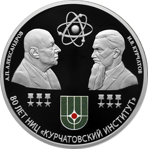 рельефные изображения портретов трижды Героев Социалистического Труда, академиков А.П. Александрова и И.В. Курчатова, золотых медалей «Серп и Молот» и символа атома; внизу — выполненное в цвете изображение эмблемы НИЦ «Курчатовский институт»; по окружности — рельефные надписи: слева — «А.П. АЛЕКСАНДРОВ», справа — «И.В. КУРЧАТОВ», внизу — «80 ЛЕТ НИЦ «КУРЧАТОВСКИЙ ИНСТИТУТ».