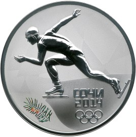 на матовом поле диска - рельефное изображение спортсмена, бегущего на коньках, внизу в две строки – надпись: "СОЧИ" и дата: "2014", под ними – пять олимпийских колец, внизу слева у канта – цветное изображение веточки тиса ягодного.