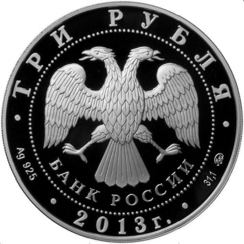 в центре – эмблема Банка России (двуглавый орёл с опущенными крыльями, под ним – надпись полукругом "БАНК РОССИИ"), обрамленная кругом из точек и надписями по кругу – вверху: "ТРИ РУБЛЯ", внизу: слева – обозначения драгоценного металла и пробы сплава, в центре – дата выпуска "2013 г.", справа – содержание химически чистого металла и товарный знак монетного двора.