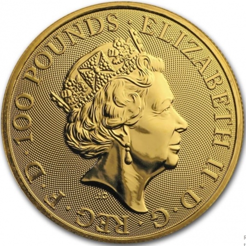 • Аверс: Портрет Ее Величества Королевы Елизаветы II, выполненный Джоди Кларком, представленный на британских монетах с 2015 года (так называемый пятый тип монетного портрета королевы). По краю монеты расположены надписи, указывающие номинал монеты и имя Королевы: 100 POUNDS / ELIZABETH II / D / G / REG / F / D.