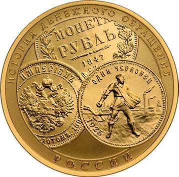 Реверс: изображения трёх монет: вверху - серебряного рубля Николая I, слева - золотого империала Николая II, справа - золотого червонца советского чекана, по окружности - надпись: "ИСТОРИЯ ДЕНЕЖНОГО ОБРАЩЕНИЯ РОССИИ".